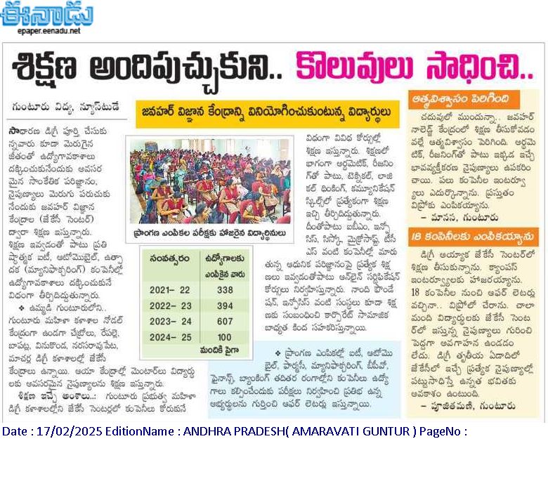 Govt. College for Women, GUNTUR is one among 11 Degree colleges in Andhra Pradesh, in which JKCs were established first time in the year 2006. In JKC the students are trained to learn the technical skills, soft skills, project management skills, problem solving techniques and communication skills by employing accelerated learning strategies.